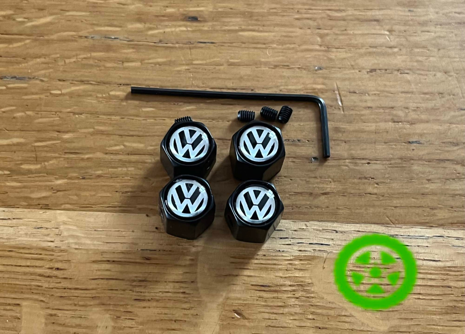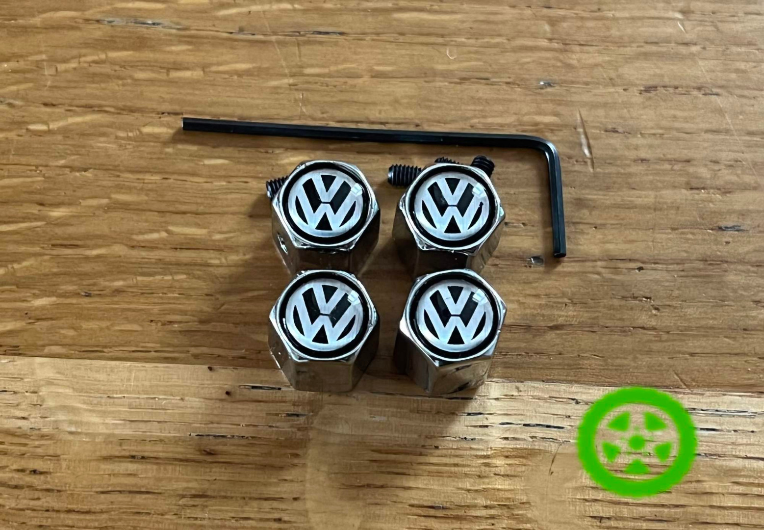 В комплекте: 4 колпачка с логотипом Volkswagen, 4 контр болтика, ключик шестигранник вкручивать контр болтики.