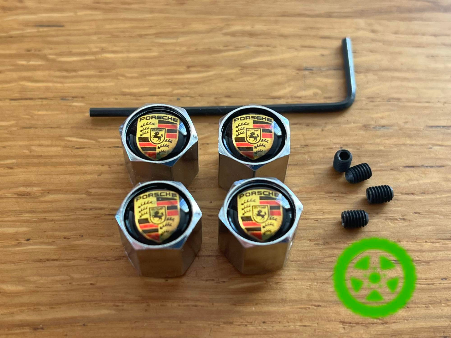 В комплекте: 4 колпачка с логотипом Porsche, 4 контр болтика, ключик шестигранник вкручивать контр болтики.